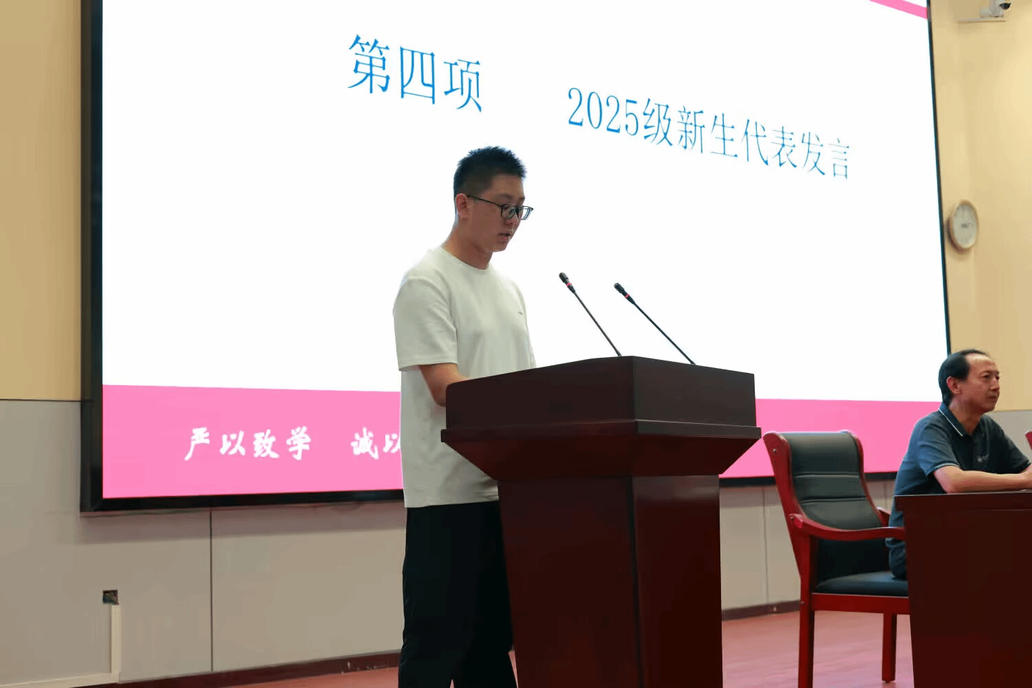 新生代表吕金灿随后发言,他分享了收到录取通知书时的激动,以及了解永利集团3044noc登录入口学科成果后的向往。他承诺将以认真态度打好专业基础,主动参与学术实践与集体活动,既要潜心钻研知识,也要积极融入集体,用四年努力成长为有理想、有担当的数统学子,不辜负永利集团3044noc登录入口与家人的期待。