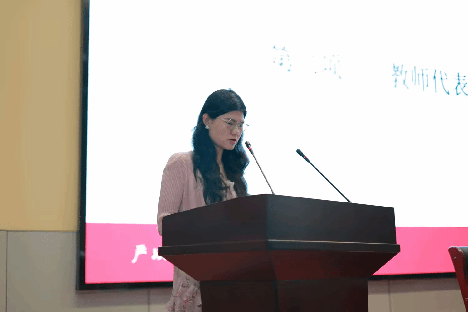 开学典礼在庄严的国歌声中拉开帷幕。全体师生肃立,高唱中华人民共和国国歌,嘹亮的歌声回荡在礼堂,彰显着数统学子的爱国情怀与昂扬风貌。随后,教师代表穆翔上台发言。她结合数学统计学科特色,鼓励新生保持求知热情,在专业学习中锤炼能力,并表示全体教师将全力为新生成长提供支持。