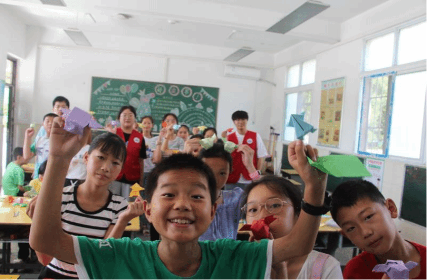 第一次见面,一首《孤勇者》的合唱,立刻拉近了与孩子们之间的距离。为了激发孩子们的想象力和创造力,提升审美情趣,志愿者给孩子们上了一堂美工课,他们讲解了绘画技巧、色彩搭配等,让小朋友们发挥自己的想象力开始创作。不一会儿,一幅幅色彩亮丽的图案跃然纸上。随后,志愿者们给孩子们分发卡纸,开始进行手工折纸, 他们耐心、细致的给小朋友们讲解折纸的基本方法和过程,通过小老师们的亲身示范和手把手的教学,他们用五彩缤纷的纸张折出各种各样的作品,他们举着自己亲手制作的作品,每个孩子的脸上都洋溢幸福和快乐。