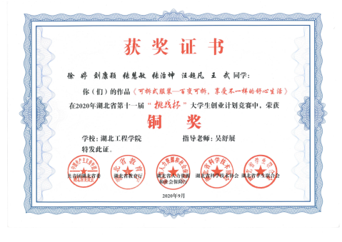 本网讯:近日,湖北省第十一届“挑战杯”大学生创业计划竞赛颁奖典礼在湖北工业大学图书馆报告厅举行,我院《可拆式服装——百变可拆,享受不一样的舒心生活》项目获得铜奖。