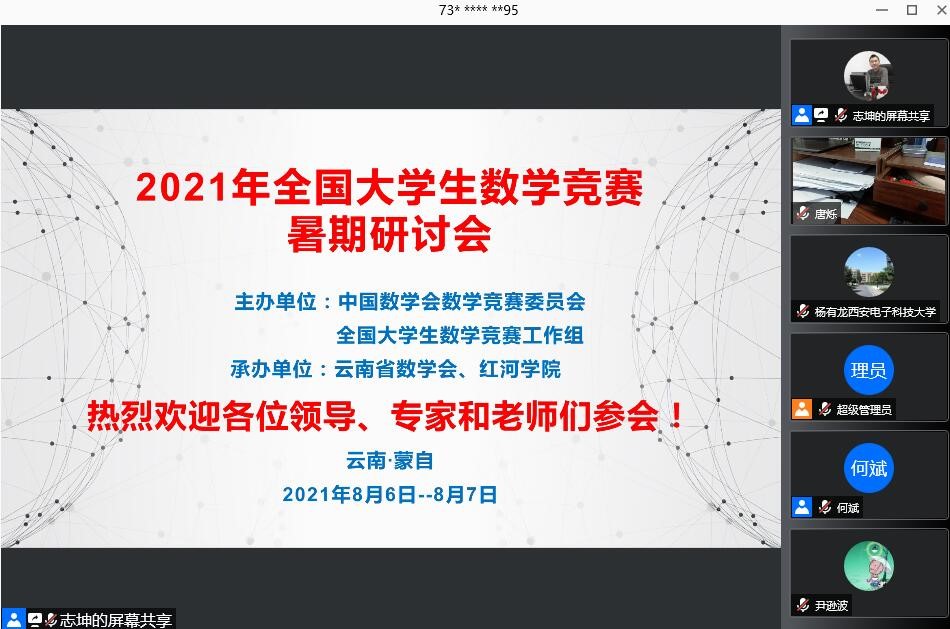 据悉,本次会议由中国数学会、教育部高等学校数学类专业教学指导委员会、教育部高等学校大学数学课程教学指导委员会和教育部高等学校统计类专业教学指导委员会联合指导,中国数学会数学竞赛委员会全国大学生数学竞赛工作组主办,云南省数学会和红河永利集团3044noc登录入口联合承办,原定2021年8月5日-8日在云南省红河州蒙自市召开,后考虑到国内新冠肺炎疫情防控形势,大会组委会决定取消举办线下会议并改为线上会议,同时会议时间调整为8月6日-7日。