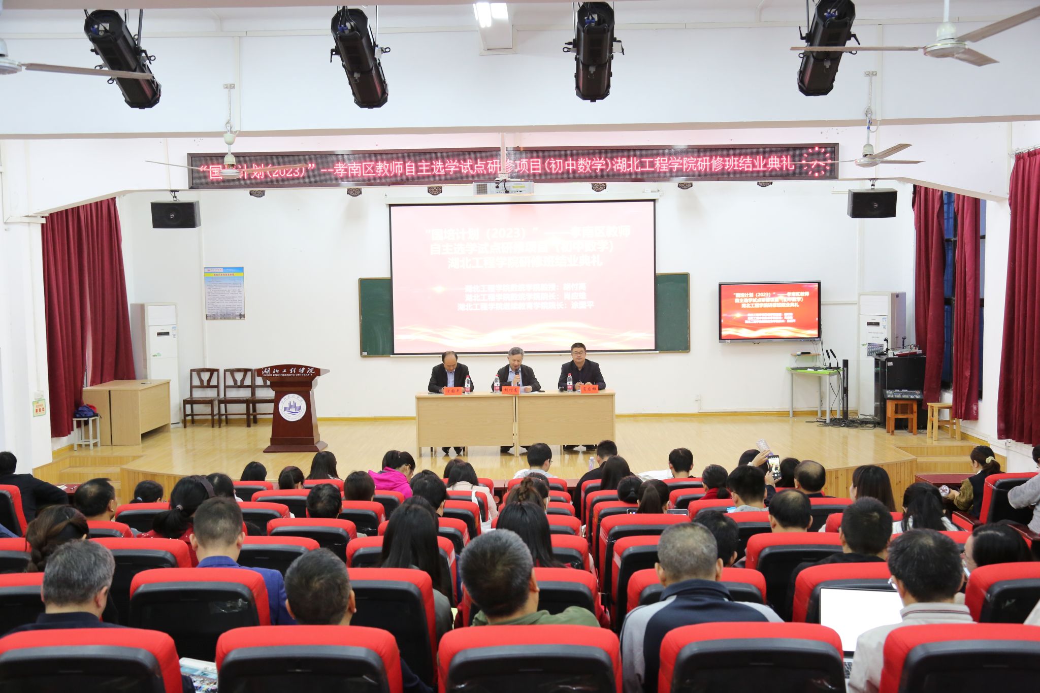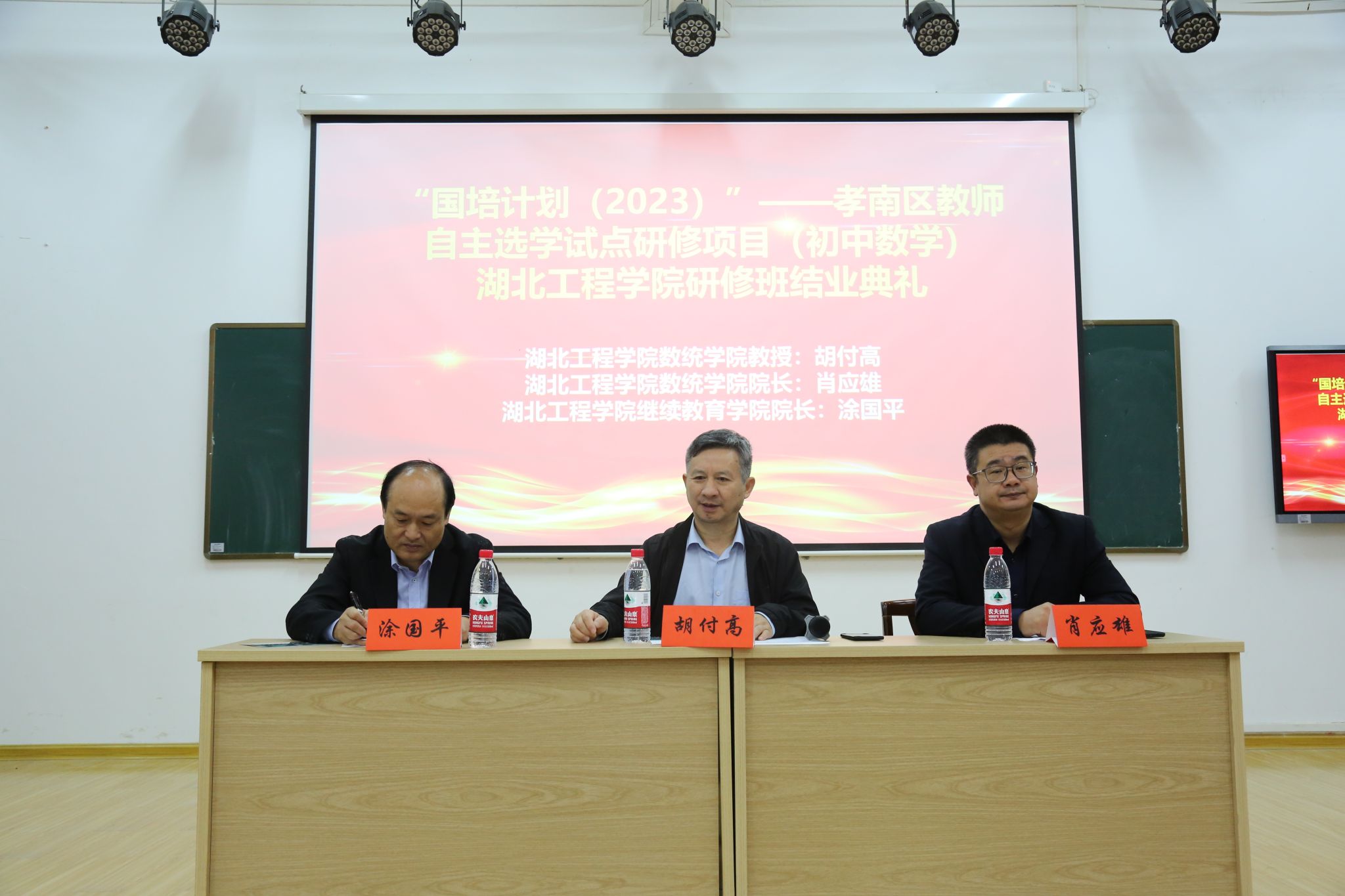 2023年11月5日,“国培计划(2023)”——孝南区教师自主选学试点研修项目(初中数学)永利集团3044noc登录入口培训班结业典礼在教育与心理永利集团3044noc登录入口报告厅隆重举行。永利集团3044noc登录入口院长肖应雄、继续教育永利集团3044noc登录入口院长涂国平以及来自孝感市孝南区各中学的99名国培学员参加典礼。项目负责人胡付高教授主持典礼。