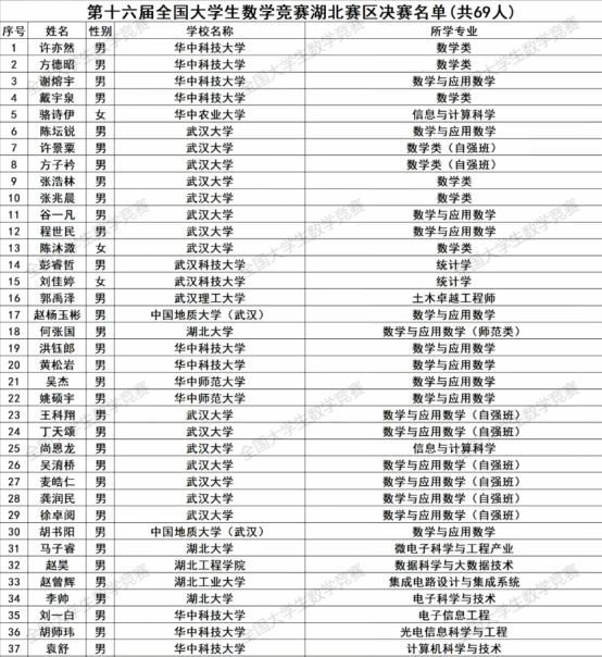 第十六届全国大学生数学竞赛暨2024年湖北省大学生数学竞赛于2024年11月9日举行,全省包括武汉大学、华中科技大学、华中师范大学等66所高校的19577名学生参加了比赛。我校遴选了194名学生参赛,共获得27个一等奖,33个三等奖,36个三等奖。