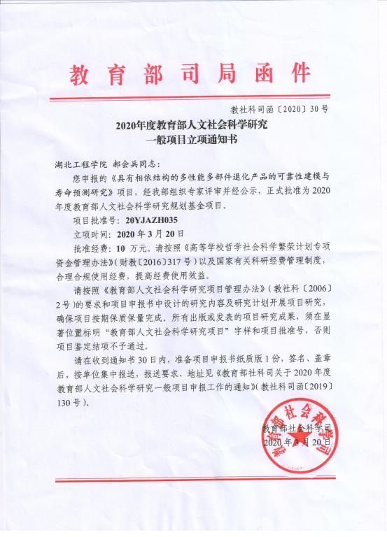 本网讯:近日,教育部发布2020年度人文社会科学研究项目立项通知,我校3个项目喜获立项。其中,永利集团3044noc登录入口郝会兵博士主持的《具有相依结构的多性能多部件退化产品的可靠性建模与寿命预测研究》获批规划基金项目,批准经费10万元,这也是郝会兵博士博士第二次获得教育部规划项目。据悉,永利集团3044noc登录入口教师近几年来共获得教育部自然科学重点项目、人文社科规划基金项目、青年项目8项。